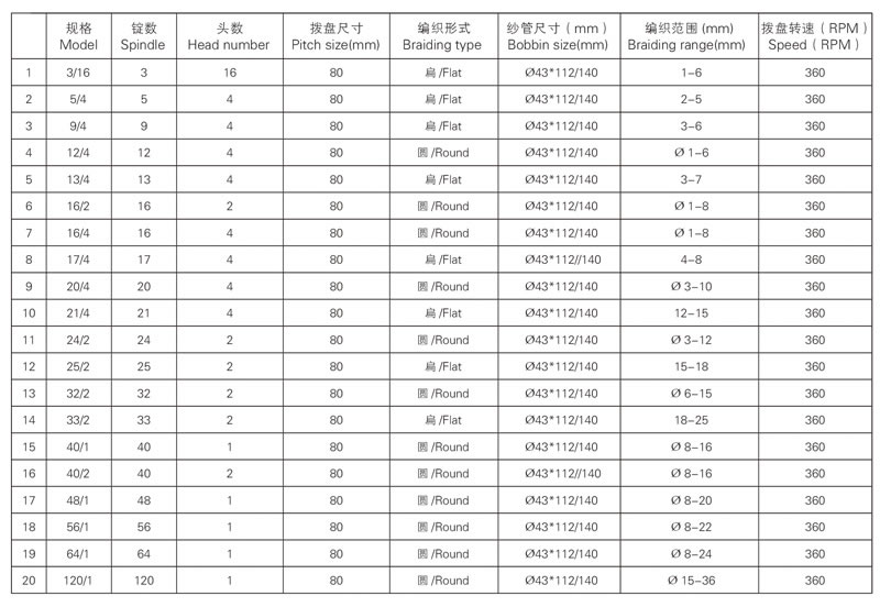 我公司生產(chǎn)的 80 系列高速編織機(jī)被廣泛的用于編織各種圓的或者扁的繩帶(鞋帶、手提帶、拖車?yán)K、行李繩、釣魚線、玻纖管、高壓膠管、裝飾繩、松緊帶等)和電線電纜(高溫導(dǎo)線、屏蔽線等)。