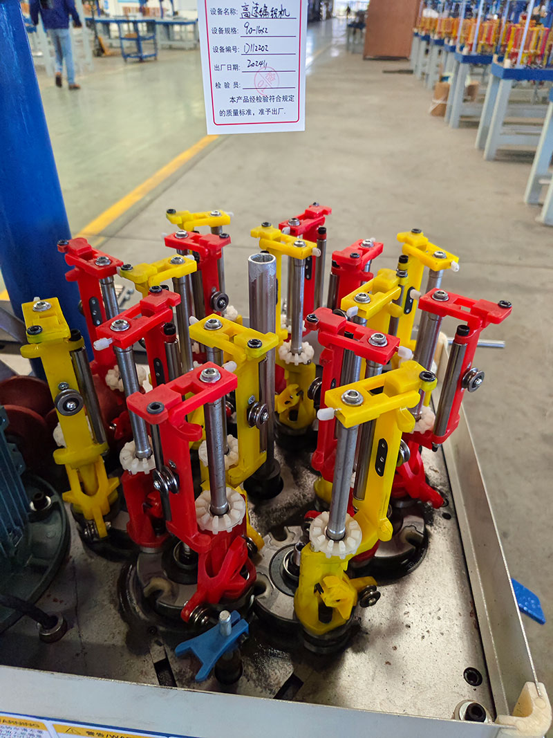 編制成品:金屬絲石墨線 材料名稱:金屬絲、不銹鋼絲、銅絲帶芯線。138牙斜滾筒牽引,90電線錠子,帶簡易放線架,放線盤尺寸直徑215*孔徑30*高度265mm , 帶收排線架 ,線盤尺寸同放線盤尺寸。帶收線放線,普通三孔穿線板,中心芯管,380V,三相,益電通 90電線錠0.6簧,紗管44*85,可纏繞膜密封,掛線出廠。